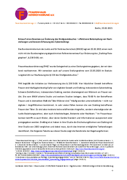 Am 15. Februar 2021 hat das BMJV einen - noch mit der Bundesregierung abgestimmten - Referentenentwurf zur Änderung des Paragraphen 238 im Strafgesetzbuch vorgelegt. Erklärtes Ziel ist es, Nachstellungen / Stalking effektiver zu bekämpfen und auch Fälle von Cyberstalking künftig besser zu erfassen. Der Einladung zur Stellungnahme ist FHK dankend gefolgt. Bereits am 15.Mai 2020 hatte Frauenhauskoordinierung zur Evaluierung der Neufassung des §238 StGB Stellung genommen.