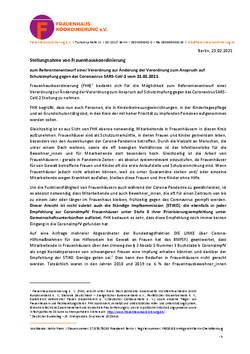 Auf eine Anfrage mehrerer Abgeordneter der Bundestagsfraktion DIE LINKE über Corona-Hilfsmaßnahmen für das Hilfesystem bei Gewalt an Frauen hat das BMFSFJ geantwortet, dass Mitarbeitende in Frauenhäusern über den Umweg des § 3 Absatz 1 Nummer 3 Buchstabe b CoronaImpfV als enge Kontaktpersonen von schwangeren Frauen eine Impfung erhalten könnten und darüber der Empfehlung der STIKO Genüge getan sei.2 Dies kann den Bedarfen in Frauenhäusern nicht gerecht werden. Tatsächlich waren in den Jahren 2018 und 2019 ca. 6 % der Frauenhausbewohner_innen schwanger. In absoluten Zahlen sind das mehr als 400 Frauen. Bei einer Gesamtzahl von ca. 353 Frauenhäusern in Deutschland bedeutet das, dass statistisch sowieso in jedem Frauenhaus eine schwangere Frau unterkommt. Darüber hinaus ermöglichen es die personellen Kapazitäten in den Frauenhäusern nicht, dass nur eine mitarbeitende Person mit der jeweiligen Schwangeren Kontakt hat. Der Umweg, eine Impfung über § 3 Absatz 1 Nummer 3 Buchstabe b CoronaImpfV zu begründen, ist insofern nicht nur aufwendig und unsachgemäß, sondern auch widersprüchlich zum gewollten Zweck. Er wird zudem weder dem Schutz schwangerer Personen noch aller anderen Bewohner_innen und Mitarbeitenden der Frauenhäuser gerecht.