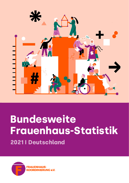 Säulendiagramm, auf dem vielfältige Frauen, teils mit Kindern, nach oben klettern. Titel: Bundesweite Frauenhaus-Statistik 2021