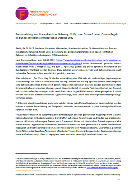 FHK betont, dass Frauenhäuser anders als bei den bisher getroffenen Regelungen berücksichtigt werden müssen – und die Einbeziehung der Zivilgesellschaft nicht durch unrealistisch kurze Stellungnahmefristen vereitelt werden darf.