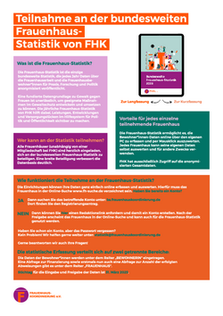 Frauenhauskoordinierung e.V. (FHK) möchte alle Frauenhäuser und Schutzwohnungen in Deutschland dazu motivieren, sich an der jährlichen bundesweiten Frauenhaus-Statistik zu beteiligen - unabhängig davon, ob sie Mitglied bei FHK sind oder nicht. Informationen finden Sie im beigefügten Flyer.