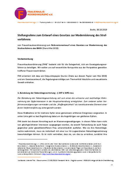 Frauenhauskoordinierung (FHK) bedankt sich für die Gelegenheit, sich am Gesetzgebungsverfahren zu beteiligen. Wir wollen uns auf wesentliche Kernpunkte aus der Perspektive gewaltbetroffener Frauen beschränken.