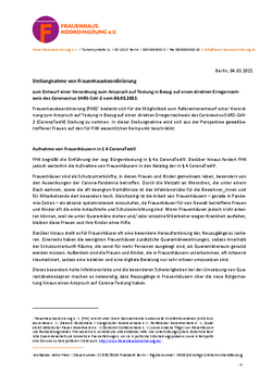 FHK begrüßt die Einführung der sog. Bürgerstestung in § 4a CoronaTestV. Das besonders hohe Infektionsrisiko und die besonderen Schwierigkeiten bei der Umsetzung von Quarantänekonzepten machen es notwendig, dass Neuzugänge in Frauenhäusern über die neue Bürgertestung hinaus einen Anspruch auf Corona-Testung haben. Daher fordert FHK weiterhin die Aufnahme von Frauenhäusern in den Katalog der in § 4 CoronaTestV.