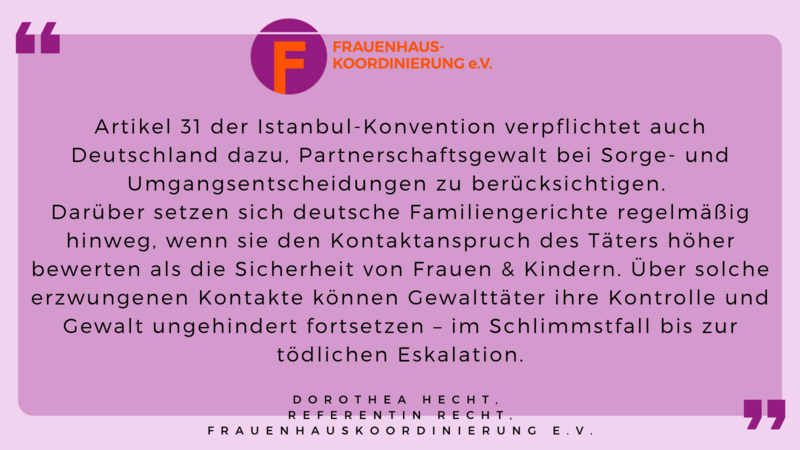 "Artikel 31 der Istanbul-Konvention verpflichtet auch Deutschland dazu, Partnerschaftsgewalt bei Sorge- und Umgangsentscheidungen zu berücksichtigen. Darüber setzen sich deutsche Familiengerichte regelmäßig hinweg, wenn sie den Kontaktanspruch des Täters höher bewerten als die Sicherheit von Frauen & Kindern. Über solche erzwungenen Kontakte können Gewalttäter ihre Kontrolle und Gewalt ungehindert fortsetzen – im Schlimmstfall bis zur tödlichen Eskalation." - Dorothea Hecht, Referentin Recht, Frauenhauskoordinierung e.V.