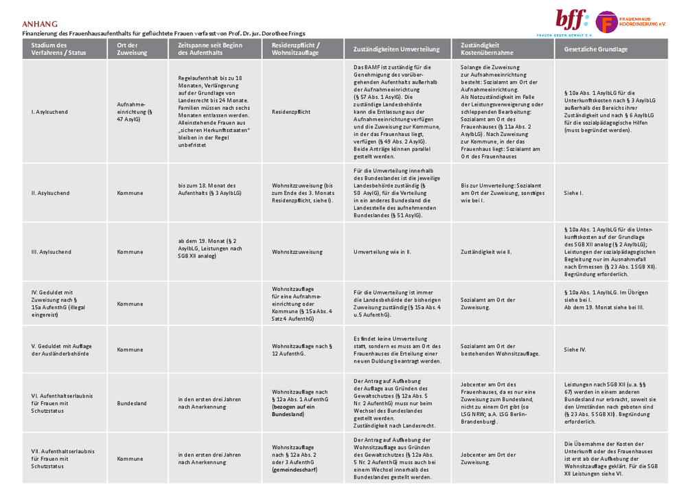 Dorothee Frings, Tabelle: „Finanzierung des Frauenhausaufenthalts für geflüchtete Frauen“
