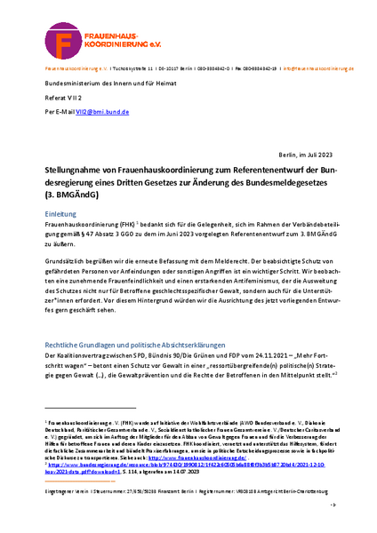 Die Bundesregierung legt zur Änderung des Bundesmeldegesetzes einen Referentenentwurf vor - geschickt in der Sommerpause. Damit soll „der Schutz von gefährdeten Personen vor Anfeindungen oder sonstigen Angriffen“ optimiert werden, um „Personen besser vor einer missbräuchlichen Ausforschung ihrer Wohnanschrift zu schützen“. FHK verfolgt seit Jahren das Ziel, dass sich Bewohner*innen von Frauenhäusern nicht unter der sogenannten Klaradresse melderechtlich anmelden müssen. Zwar kann ihnen inzwischen eine Auskunftssperre eingerichtet werden, auf dem Identitäts-Ausweis erscheint dennoch die Hausanschrift. FHK hat sich im Rahmen der Verbändeanhörung erneut positioniert. Näheres in unserer Stellungnahme.