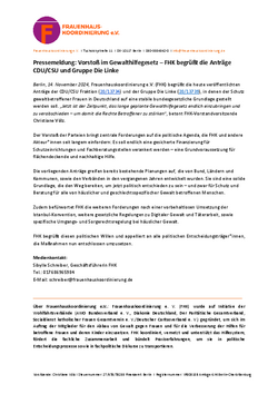 Berlin, 14. November 2024, Frauenhauskoordinierung e.V. (FHK) begrüßt die heute veröffentlichten Anträge der CDU/CSU Fraktion (20/13734) und der Gruppe Die Linke (20/13739), in denen der Schutz gewaltbetroffener Frauen in Deutschland auf eine stabile bundesgesetzliche Grundlage gestellt werden soll.