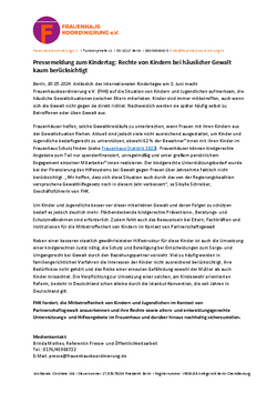 Anlässlich des Internationalen Kindertages am 1. Juni macht Frauenhauskoordinierung e.V. (FHK) auf die Situation von Kindern und Jugendlichen aufmerksam, die häusliche Gewaltsituationen zwischen Eltern miterleben. Kinder sind immer mitbetroffen, auch wenn sich die Gewalt nicht gegen sie direkt richtet. Nachweislich werden sie später häufig selbst zu Betroffenen oder üben Gewalt aus.