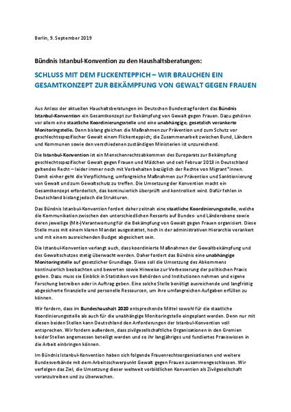 Anlässlich der aktuellen Haushaltsberatungen im Deutschen Bundestag fordert das Bündnis Istanbul-Konvention ein Gesamtkonzept zur Bekämpfung von Gewalt gegen Frauen. Im Bundeshaushalt 2020 müssen endlich die notwendigen Mittel zur Verfügung gestellt werden, um die Anforderungen der Istanbul-Konvention zu erfüllen.