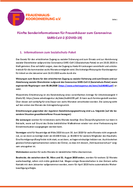 Die fünfte FHK-Sonderinformation zum Umgang mit dem Coronavirus in Frauenhäusern und Beratungsstellen enthält Informationen zu folgenden Themen: