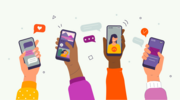 Sicherer Umgang mit Handys, Social Media & Co. - Medienpädagogik mit Frauenhauskindern. Digitale Mini-Fortbildung und Fachaustausch. 06.10.2023, 10:00-13:00 Uhr, Digital per Videokonferenz Zoom: Abbildung: Kinder tippen auf ihren Handys, Emojis & Sprechblasen ploppen auf